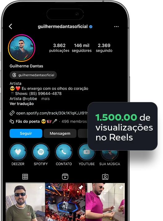 Marketing pessoal completo para grandes artistas. Aqui temos um plano de marketing completo focado na imagem do artista com um plano de postagem diário no feed e stories, trazendo mais de 30 posts por mês no feed, entre fotos, vídeos e animações.